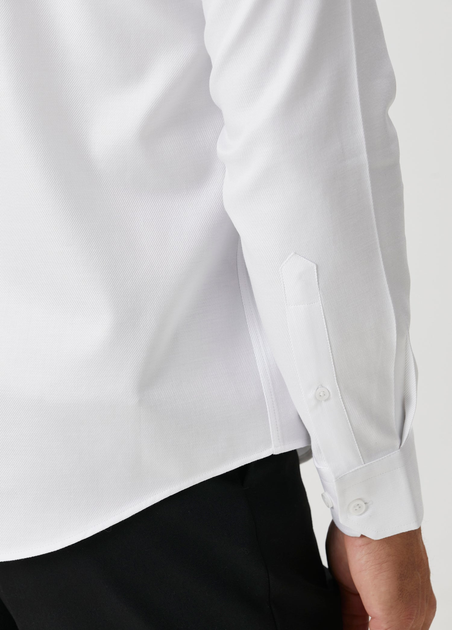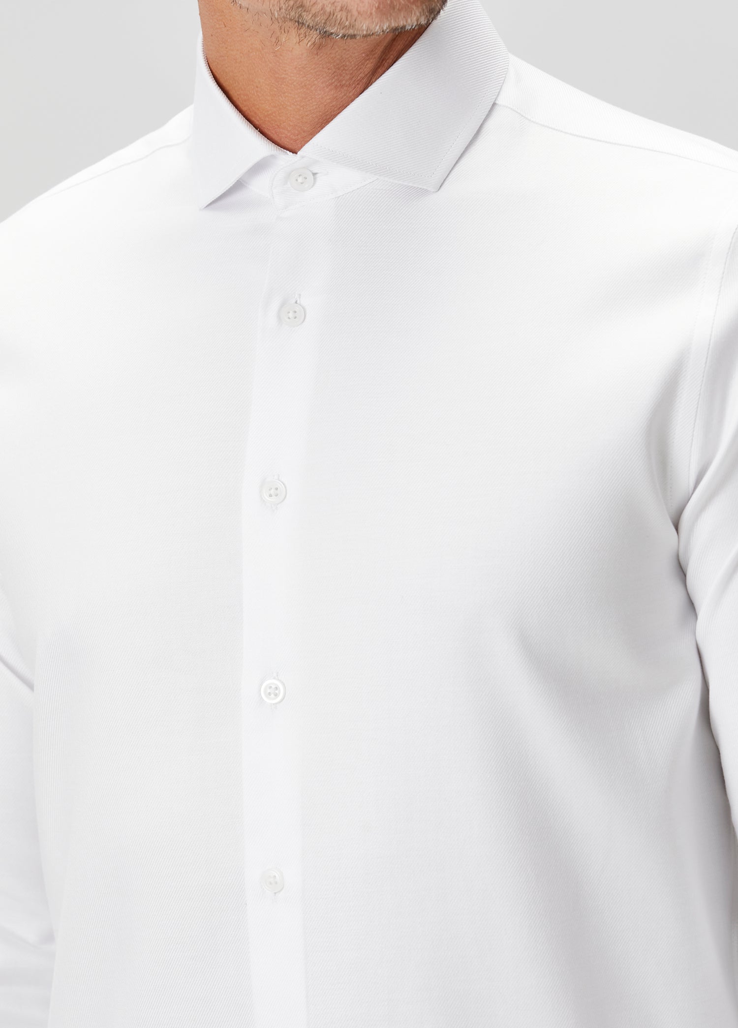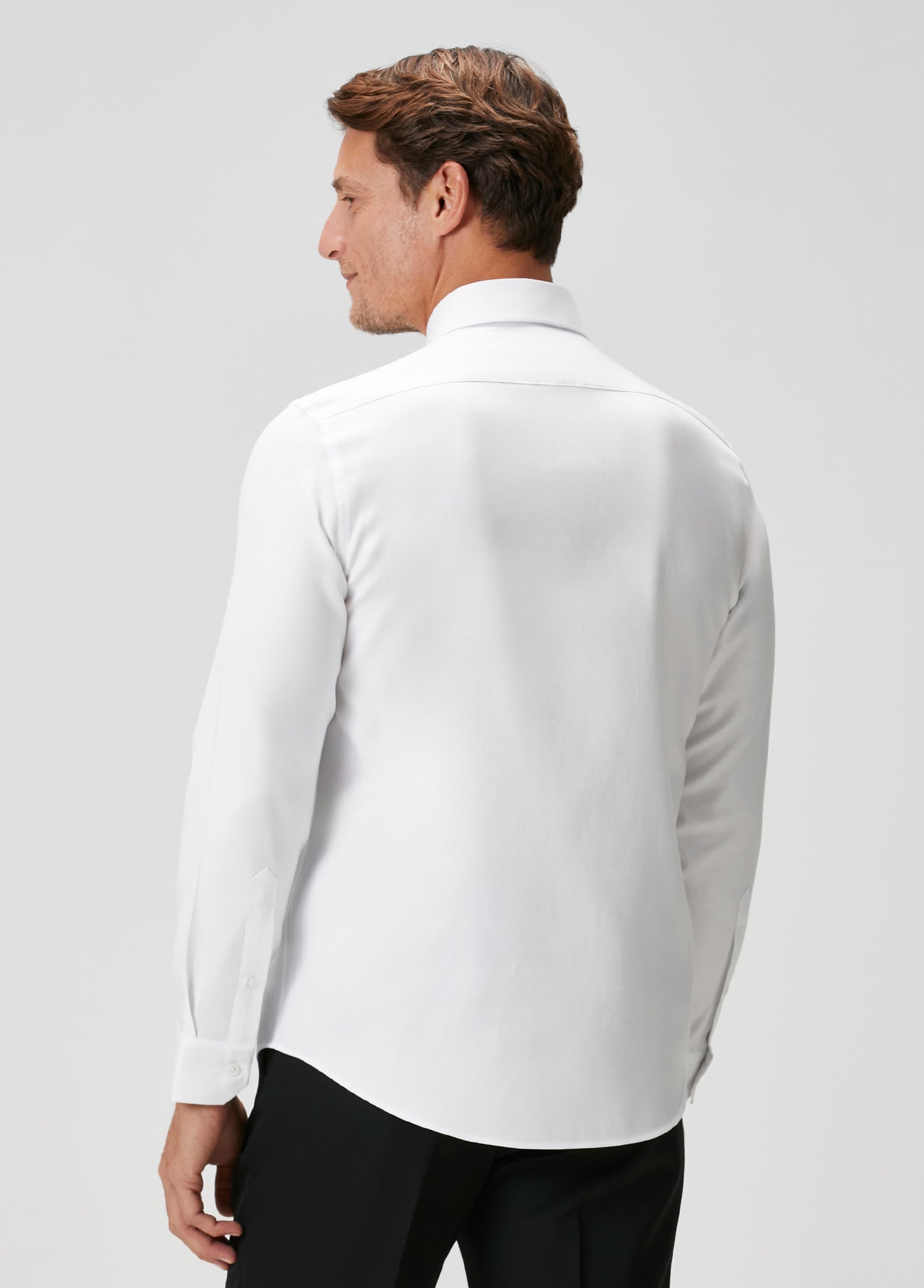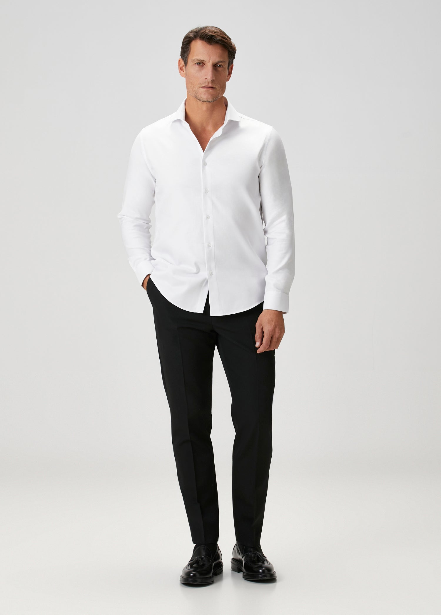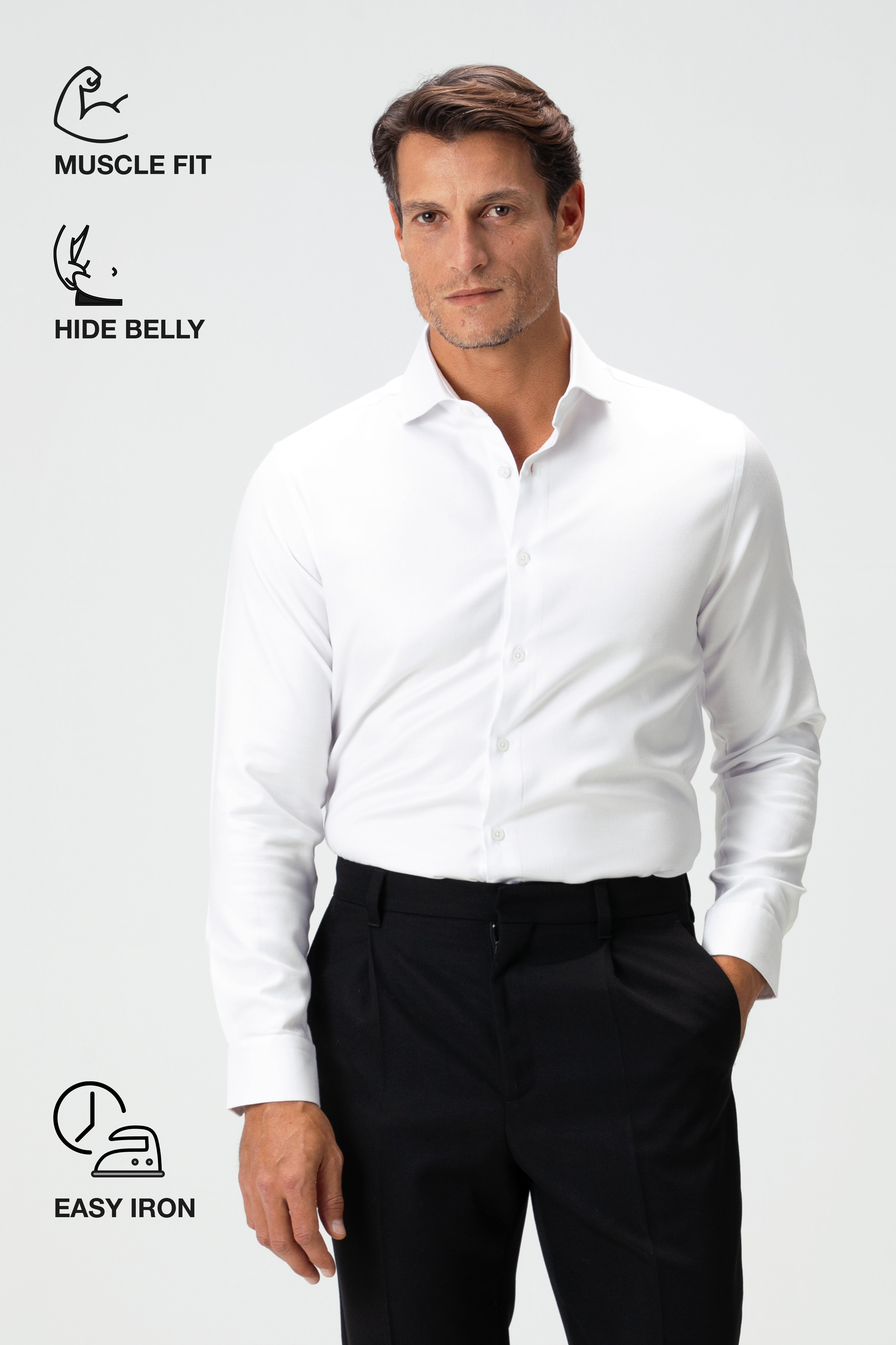 Double-Twist Cotton Italian Shirt yapısı, çift bükümlü pamuk iplikleri sayesinde daha pürüzsüz, daha dayanıklı ve daha dolgun bir yüzey sunar. Bu premium dokunun easy-iron özelliği ile birleşmesi, beyaz gömleğe modern bir zarafet ve pratiklik kazandırır. Kırışma karşıtı kumaş hızlı ütülenir, gün boyunca formunu korur ve cilde nefes alabilir bir temas sağlar.