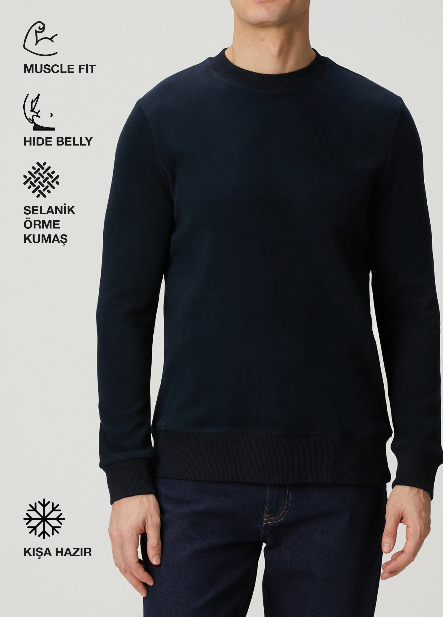Bisiklet yaka sweatshirt, kış stilinde sade ama güçlü bir duruş arayan erkekler için tasarlandı.